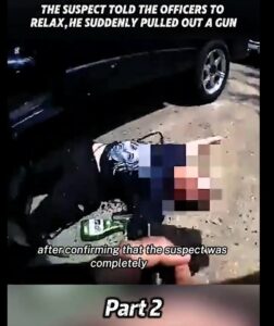 Moments later, the situation escalates when the suspect makes a sudden movement and produces a weapon, creating an immediate risk for those present. Officers respond quickly as the encounter becomes increasingly tense.