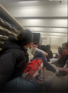 The footage, dated December 13, shows students sitting on the floor in what appears to be a storage or classroom space. Several students are seated against walls and shelves, remaining quiet