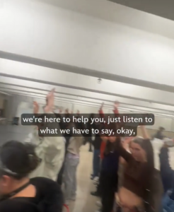 Later in the video, police officers can be seen entering the room and calmly instructing the students to leave the area. The students exit the space in an orderly manner under police supervision.