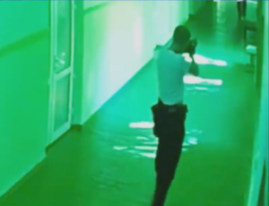 The footage, presented in a breaking news format, alleges that at least two people were killed and several others injured, with a manhunt reportedly underway for a suspect. The video shows what appears to be surveillance-style hallway footage of an armed individual moving through an indoor corridor, while on-screen graphics describe an active and developing situation.