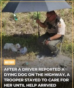 I followed him to the spot. The dog was still there, panting heavily and barely moving. The trooper emptied his water jug and turned it into a bowl, then poured in bottled water. The dog seemed frightened, but too weak to move away. After sniffing the water, she began drinking quickly and finished it within minutes.