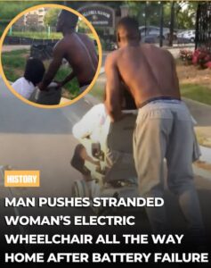 In recent years, a short video shared online showed a young man noticing a woman stranded when her electric wheelchair lost power on the street. Instead of walking past, he stopped and asked if she needed help. When he realized she couldn’t move on her own, he made a simple decision. He began pushing her wheelchair himself, staying with her the entire way until she safely reached home.