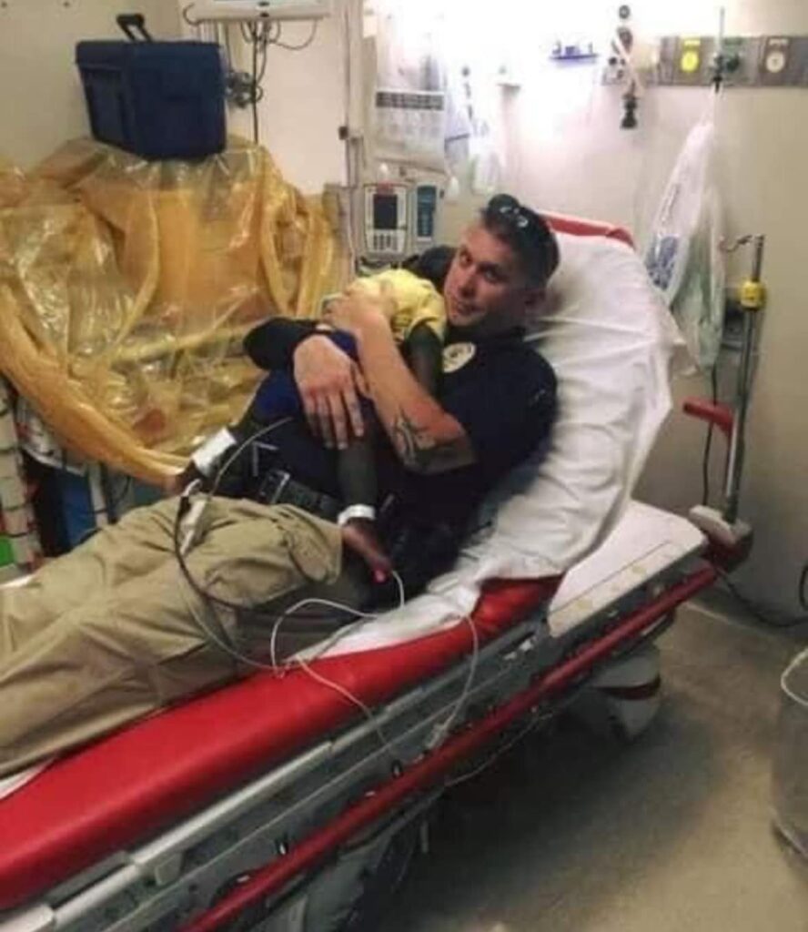 “I just knew this child needed somebody to be there for him,” the officer said later. “It was just human instinct; humanity. The hospital staff was taking great care of him, but he was sobbing and crying. I picked him up and within minutes, he was asleep on my chest.”