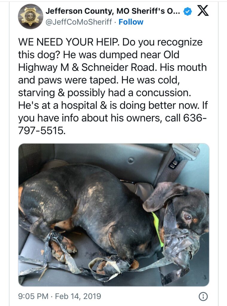 Officers in Missouri have arrested a heartless man who bound a Dachshund’s mouth and feet with electrical tape, and then tossed the dog in a ditch in freezing temperatures.