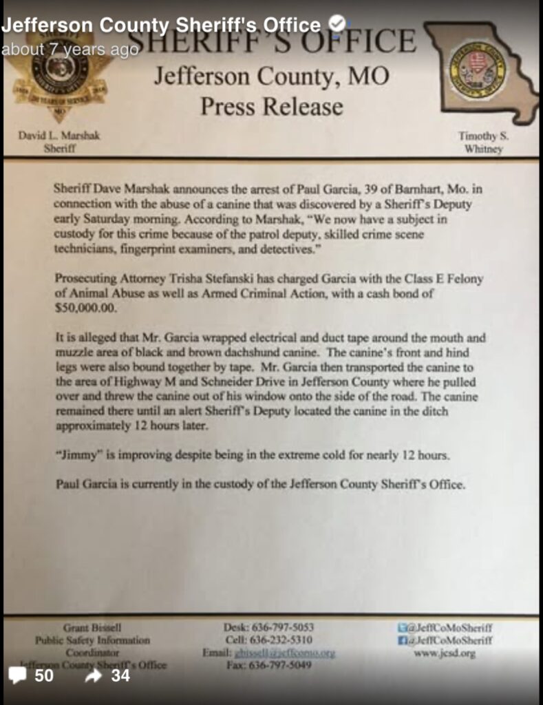 Jefferson County Sheriff’s Office released a statement saying Paul Garcia was arrested and charged with felony animal abuse and armed criminal action charges. His bail was set at $50,000. “We now have a subject in custody for this crime because of the patrol deputy, skilled crime scene technicians, fingerprint examiners, and detectives.”